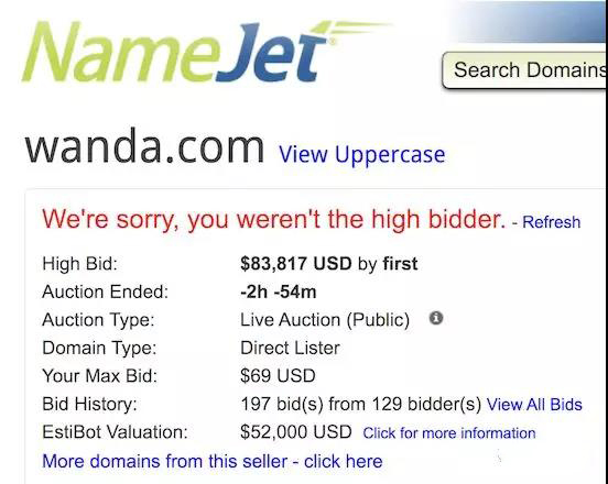 Wanda.com在NameJet上结束了公开拍卖。该域名以83817美元的价格出售。在这次拍卖中,有129个投标人投了197个标。该域名由私人卖家出售,而不是在更典型的到期拍卖中。