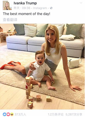 伊万卡正在教最小的儿子,刚过完一岁生日的西奥多学习中文。这位35岁的母亲日前贴出了一张自己与儿子在客厅中的合影,并附言“一天中最美好的时光!”《每日邮报》称,