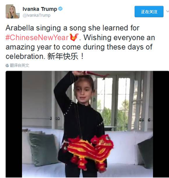 不只这次,今年春节,伊娃卡发推特给“每一个人”拜年,并晒出了女儿阿拉贝拉用中文演唱《新年好》的视频。要不要这么腻害!外国小萌娃分分钟秒变二人转啊有木有~~