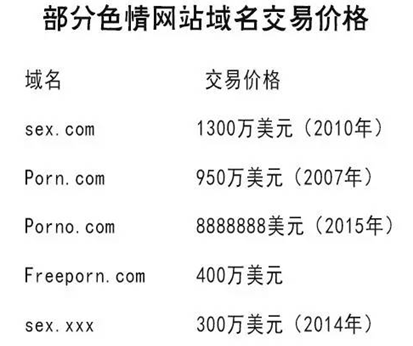 色情网站撑起了互联网半边天,网站域名更是频出天价!任何域名一旦与情色沾边,总会格外受人关注,上图是部分色情网站域名当年交易价格。