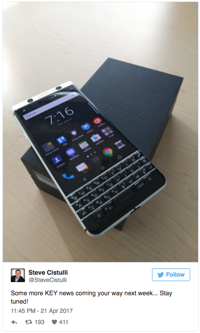 上周末,TCL通讯北美区总裁Steve Cistulli在推特上宣布,下周将有一些关于黑莓新机KEYone的重要消息公布。如果评选2017年CES消费电子展和MWC移动通信大会两个重要展会的10大新品,黑莓KEYone一定会名列其中。手机厂商们的产品乏善可陈,让提前露面的黑莓全键盘手机成了场内的焦点。4.5寸的屏幕和依然全键盘的设计,让它成为了“经典与现代的碰撞”所产生的产品(现场评测)。