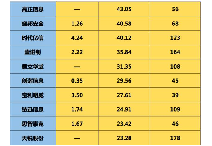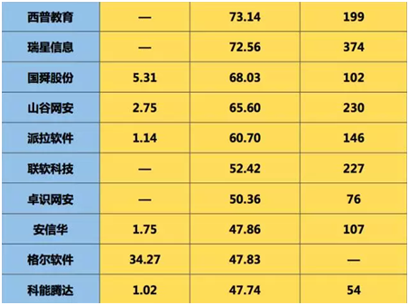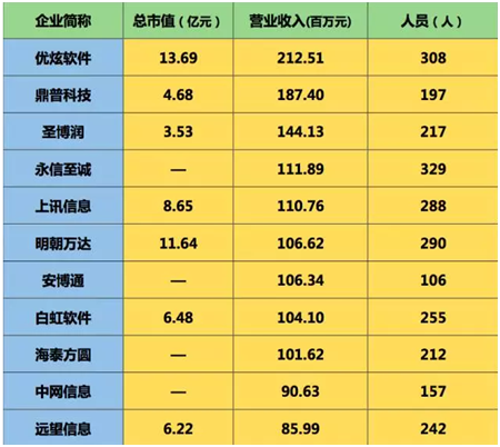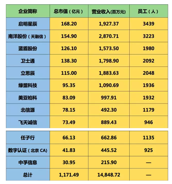 (注:以上两表“总市值”数据有效期截止日期为2017年06月13日,“营业收入”为2016年全年财报数据。其中,中孚信息因2017年5月26日才在深圳证券交易所创业板上市交易,故市值为6月19日当天数据。)