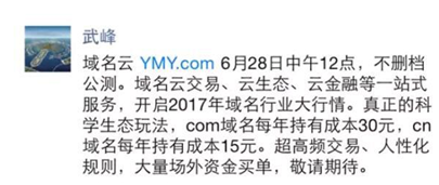 大佬武峰在朋友圈爆料称:3声母域名ymy.com搭建的“域名云”网站平台将会在最近上线,以提供域名一站式服务为主。距今不到两个月,域名ymy.com完成交易。