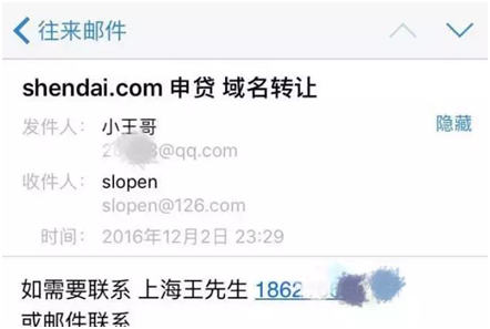 其实,2016年12月2月,域名投资人“小王哥”曾把域名“shendai.com”推荐给“上海申亘”旗下的“申贷”,不知何原因,他们并未搭理“小王哥”。