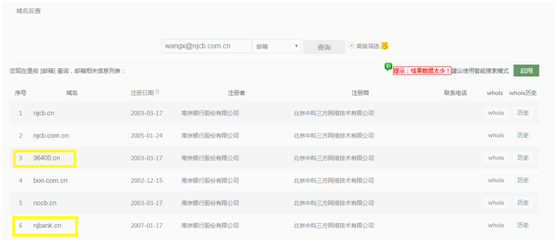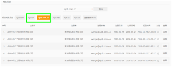 通过whois的查询了解到南京银行注册了njcb.cn以及njcb.com.cn两个域名,但是对于njcb.xom却并没有掌握在手中。查询之余,让人窃喜的是发现南京银行还注册了96400.cn和njbank.cn两个域名,一个是純数字的域名,另一个则是将银行的主要标识bank写入了域名中。