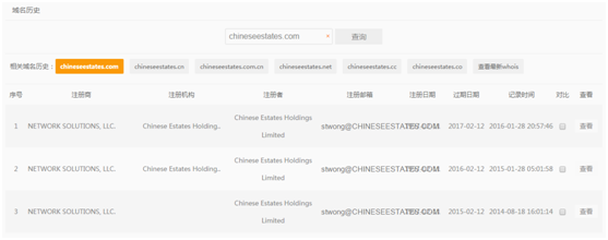 通过whois查询chineseestates.com发现: