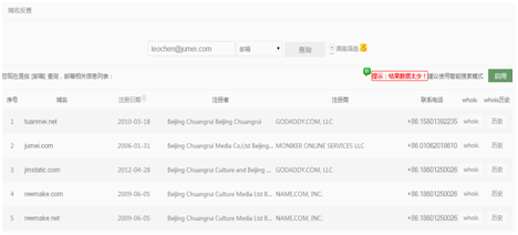 Jumei.com的注册邮箱上注册的域名寥寥无几。虽说域名和企业高管一样,都是企业的无形资产,但是两者并不会互相干扰。而且任何一个域名都不能被带走,即使是戴雨森在职时所注册的。
