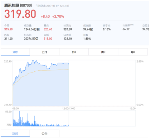 2017年8月7日,腾讯股价创历史最高纪录——320.6港币,对应市值为30375亿港元,略超过阿里巴巴的3872.27亿美元。腾讯成为了中国最大的一家上市公司。