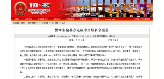 8月16日,黑河市人民政府门户网站发布了同一条消息:黑河市编委办完成中文域名全覆盖。中文域名到底是有什么样的魅力,让众多政府机构都在进行注册保护?