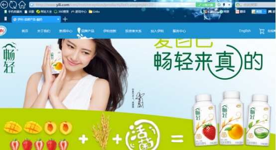 通过yili.com,打开伊利官网在品牌产品中酸奶类型,排在第一的就是畅轻。畅轻作为伊利旗下重要的酸奶产品,此次广告可以说打了一手好牌。一直以来伊利都想将畅轻这一子品牌与母品牌进行分离营销,对此伊利应该为畅轻做一个单独网站,并为该子品牌注册保护属于自己的域名。