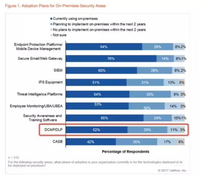 根据Gartner的2016年最终用户安全支出调查, 52%的受访者表示计划实施DCAP和DLP,同时,53%有意实施UEBA,42%计划在未来两年实施CASB。用户对这些技术的兴趣越来越大,主要是由于组织对数据保护日益增长的关注,以及遵守诸如欧盟“一般数据保护条例”(GDPR)等更强的法规。