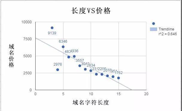 该图为某一平台域名交易中,域名字符长度和交易额的数据图。图表竖轴为域名的价格,横轴为域名字符长度。通过观察,字符在十以内,虽然价格起伏较大,但是价格均在2500以上。因此域名的价值和域名字符长短和域名价值是有很大的相关性。