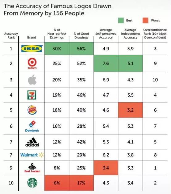 最终在整理的画中得出以下较为详细的数据,是对于图画相似性、平均准确性等数据对人们印象中的品牌LOGO进行了排名。每个品牌在LOGO的更新换代中的高额花费,以及在品牌推广和宣传中都会考虑将其印在最明显的位置,现在看来这样的付出是不是没有什么作用?