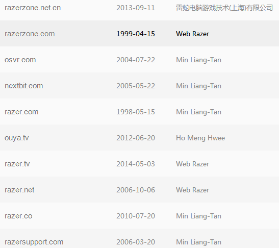 通过国旭平台反查邮箱,发现雷蛇不光保护了.com/.cn并且还把.co/.tv/.net这些后缀都进行了保护,可见雷蛇对于域名的保护意识极强。