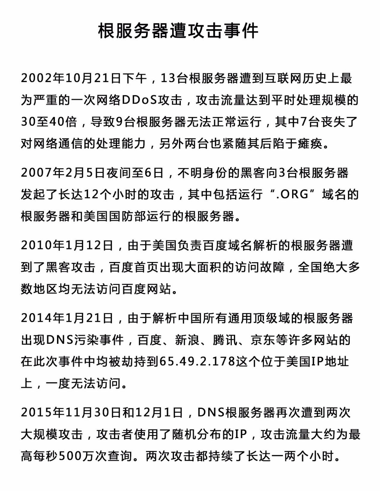 以上服务器故障、黑客攻击等问题,美国尚不能很好规避,最大原因就在于全球仅13台根服务器的集中性,难以应对大规模的DDOS(分布式拒绝服务,Distributed Denial of Service)攻击,导致服务器一旦出问题,影响将波及到全球。