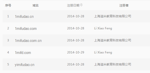 通过反查我们发现,溢米辅导十分注重域名保护,手中持有1mifudao.cn、1mifudao.com、1mifudao.com.cn、1mifd.com、yimifudao.cn、yimifudao.com域名,保护的极为完善。