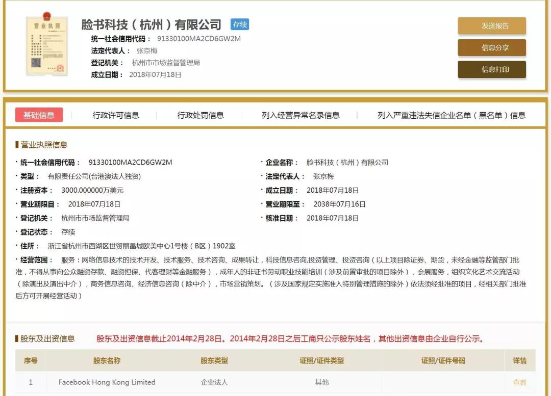 近日据各大媒体的报道,社交巨头Facebook已经吹响了进入中国市场的号角,并且在杭州设立了全资子公司,目前已经完成工商注册,子公司的名称为“脸书科技(杭州)有限公司”,成立于2018年7月18日,是Facebook控股100%的全资企业,认缴出资高达3000万美金。