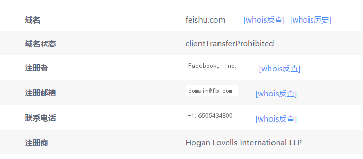 从whois信息来看,域名feishu.com是在2015年7、8月份完成交易并过户到Facebook公司名下的,当前注册者信息显示为“Facebook, Inc.”。可以说,Facebook当初选择收购适合中国网民习惯的双拼就是入华的先期准备。