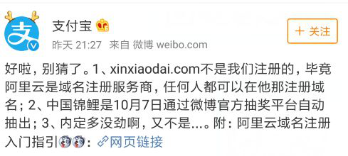 10月9日晚上,支付宝回应称,域名xinxiaodai.com并非他们注册,表示阿里云是域名注册服务商,任何人都可以在该平台注册域名。“中国锦鲤”是10月7日通过微博官方抽奖平台自动抽出,不存在内定的情况。