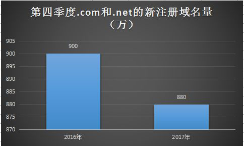 截至2017年12月31日,.com域名的注册总数为1.319亿个,.net域名的注册总数为1450万个。2016年第四季度,.com和.net的新注册域名总数为880万个,2017年第四季度顶级域名.com和.net的新注册域名总数为900万个,较去年同期增长了2.9%。