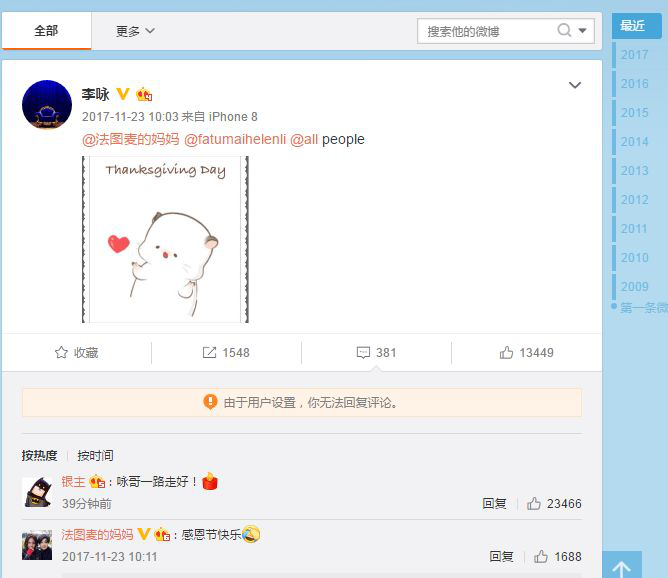 李咏最后一条微博停留在2017年11月23日。是在对妻子和女儿表达爱,而他的大部分微博,都是为他的妻子和女儿所发。