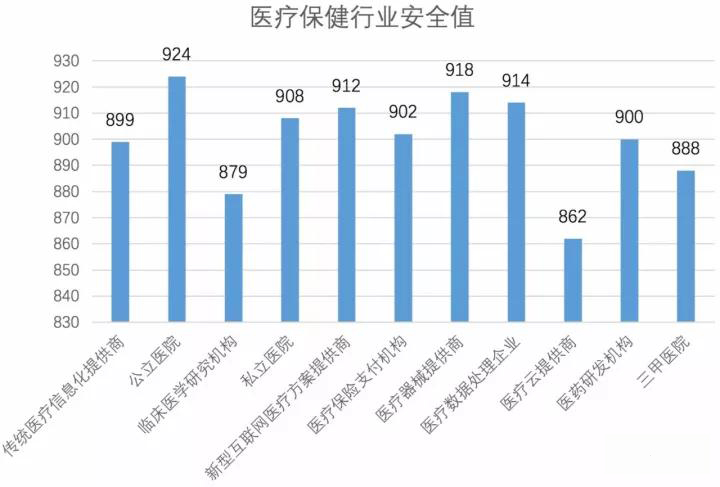 该行业来自于外部的攻击行为主要有窃取患者身份,病例或治疗信息、窃取财物办公信息、恶意软件、网络被攻击等等。外部攻击多种多样,但是攻击会集中于哪一方面?在该领域所有的相关机构中,公立医院的安全值最高,最低的是医疗云提供商。从该数据中可以得出:网络攻击,医疗数据是第一选择。数据的重要性在于,它能够推算出行业的未来趋势,其价值可想而知。