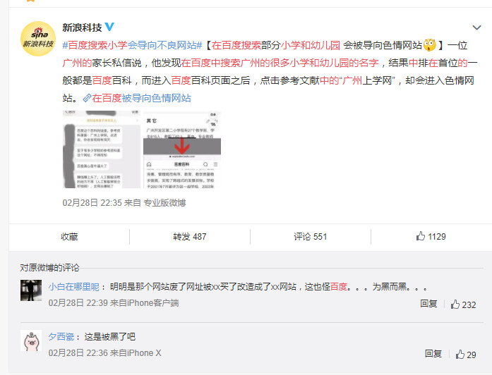 2月28日晚间消息,今天有文章指出,在百度中搜索广州的很多小学和幼儿园的名字,结果中排在首位的一般都是百度百科,而进入百度百科页面之后,点击参考文献中的“广州上学网”,却会进入色情网站。