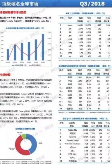 除此之外,由互联网域名系统北京市工程研究中心也发布了关于《全球域名发展统计报告》,该报告主要对2018年第三季度顶级域名全球市场、顶级域名中国市场、国际化顶级域名全球市场与新通用顶级域名全球市场等四个市场进行了统计分析。