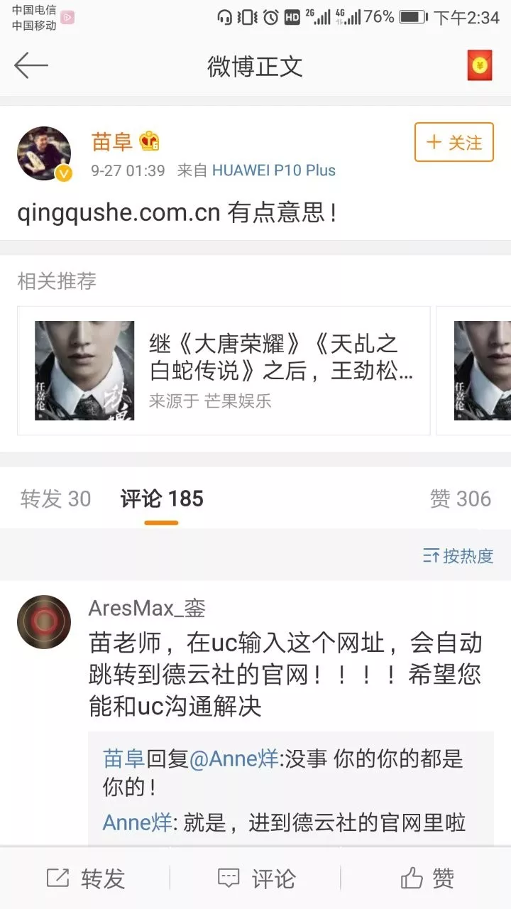 从评论中和网友的对话大致猜出:苗阜要为青曲社注册官网,但是发现域名已经被抢注,最有意思的是通过该域名竟然打开的是德云社网站。这使得众网友看到了挑衅的苗头。苗阜也貌似暗讽:“没事 你的你的都是你的!”