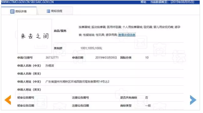 然而,有好事网友却发现“来去之间”也已经被注册了商标,在中国商标局官网上查询发现,商标被注册成国际分类10号所属商标,商品服务种类包括“按摩器械、振动按摩器、避孕套、性爱娃娃”等等。申请注册时间是2019年3月9日。
