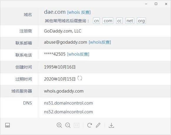 查询whois发现,域名DAE.COM注册于1995年10月16日,距今已有24年历史了。作为三字母域名,DAE.COM外形短小精悍,品相较好,简短好记、好输入,在市场上备受投资人和终端青睐;含义上,DAE对应诸多缩写词,比如“微分代数方程组”、“原子能部”等,除此以外,DAE也是一种文件扩展名称。终端方面,DAE.COM对应有DAE旅游平台以及游戏绝地求生DAE战队。