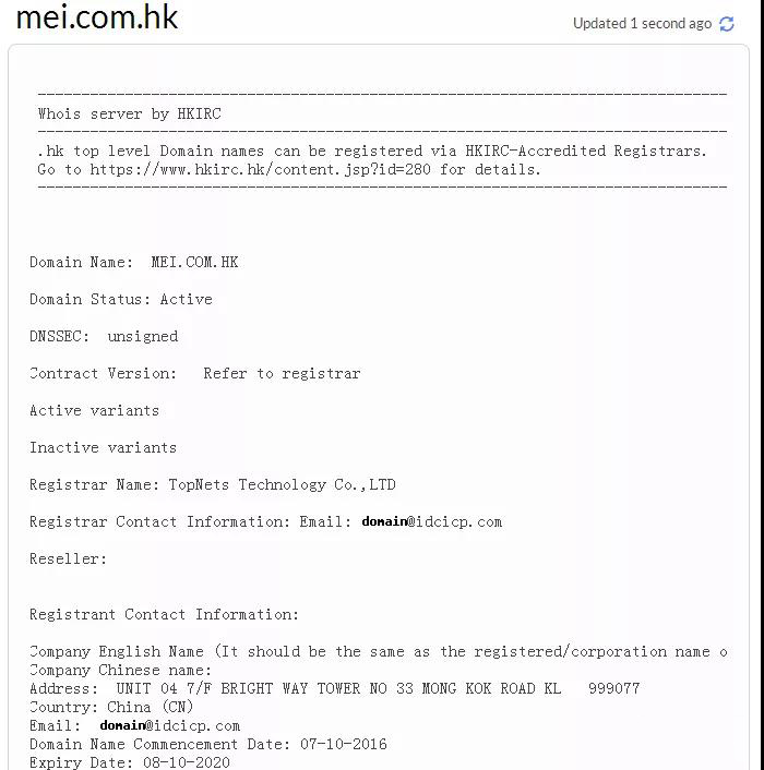 查询结果出来了,存在保密措施,该域名目前解析的是香港莉豪有限公司,这家企业隶属于美林国际投资控股集团旗下的一家企业,从媒体获悉,该集团刚完成了一家医疗整形连锁机构的收购。正筹备将医美整形和线上大数据结合提供医美O2O线上线下服务。