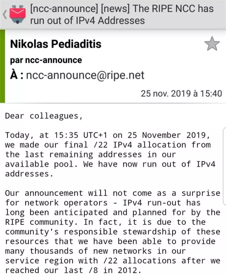 今天,在2019年11月25日UTC + 1 15:35,我们从可用池中的最后剩余地址进行了最终的 /22 IPv4 分配。现在,我们已经用完了 IPv4 地址。