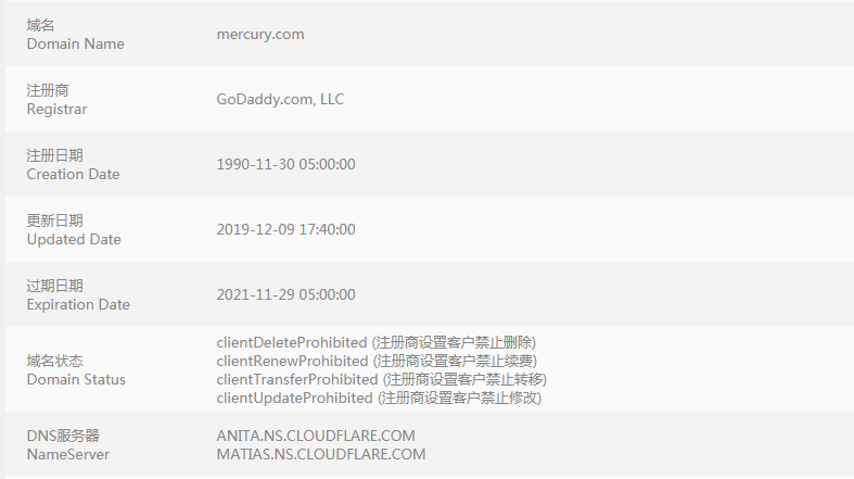 域名Mercury.com注册于1990年,是“汞、水星”的意思。据whois历史记录显示,域名Mercury.com前持有者为英国知名软件公司Micro Focus Software Inc,是专注于COBOL的上市公司。近日,域名Mercury.com转移到Escrow账户,一般这被认为是正在交易的表现,如果全部金额支付完成,Mercury.com则会转移到新的域名所有者名下。