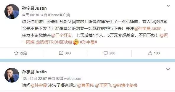 之后通过嘲笑搜狗CEO王小川、帮王思聪还债、高薪聘请罗永浩、“声援”网易绝症员工等“蹭热点”方式频频登上热搜,然而“树大招风”,在区块链形式还未明朗之前,这样吸引“韭菜”显然是不合规的。在12月12日晚间,“红”了一整年的波场创始人孙宇晨微博被封,相关页面显示该账号因被投诉违反法律法规和《微博社区公约》的相关规定,现已无法查看。