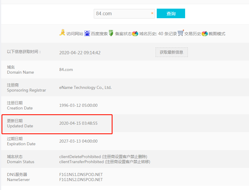 近日爆料,一枚二数字极品域名84.com通过中介平台八位数易主。据whois信息公开显示,域名84.com,注册于1996年,至今已有24年历史。该域名由吉利数字“8”与“4”所组成,可以说这是除了44.com外最好的带4两数字.com域名,字符简短,朗朗上口,易于输入记忆。从含义上来说,84.com具备“巴士”的极品含义,而且作为全世界都能看懂的数字域名,启用该域名建站的话也不会受地域文化、行业限制,建站范围非常广泛。