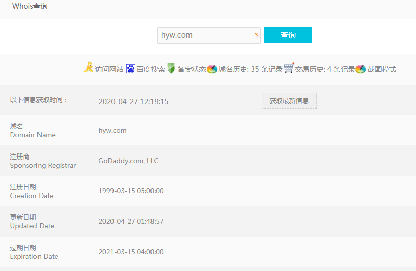 近日,三声域名 hyw.com 在域名交易平台以约15.5万元的价格结拍,注册于1999年03月15日,距今已有21年时间。该域名主体“hyw”有黄页网、婚姻网、好孕网等含义。