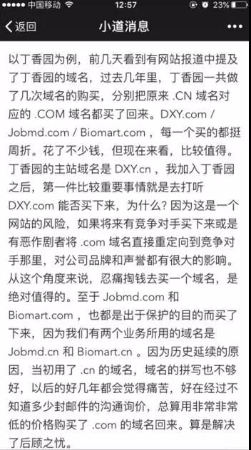 最后,以丁香园为例,下文是当时丁香园的CTO冯大辉对域名的一些看法,看图即懂: