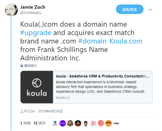 4月25日消息,一家名为koula咨询顾问公司收购了品牌域名koula.com,并正式启用为跳转域名。