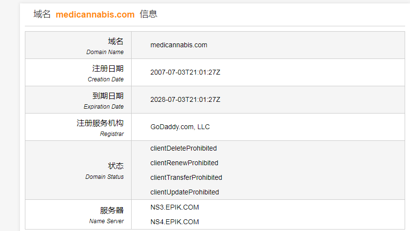 .com域名方面,域名medicannabis.com以25,770美元成交,约合人民币18万元。该域名虽然字符比价长,但是胜在含义不俗,颇具商业价值。近几年,不少与之相关的域名交易价都不错,比如CBDOil.com就在去年三月以50万美元易主终端;2018年11月,同样含义的域名Kush.com也以50万美元成交。