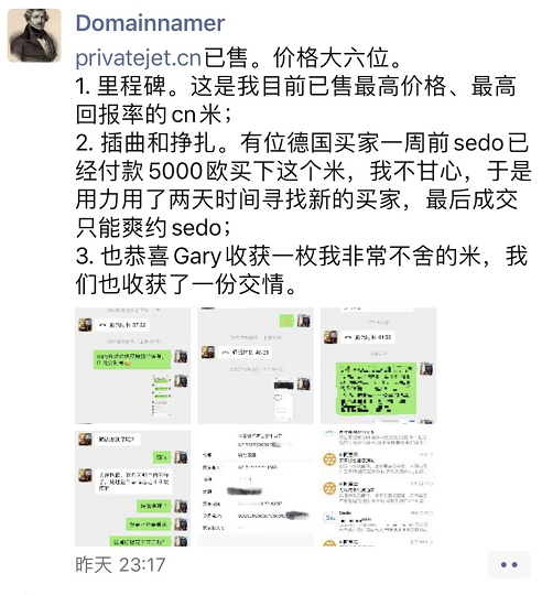 据投资介绍,这是他目前已售最高价格、最高回报率的.cn域名。出售过程中也有插曲,有位德国买家一周前sedo已经付款5000欧买下这个域名,但是又有新的买家愿意出更高的价格,最后成交只能爽约sedo。