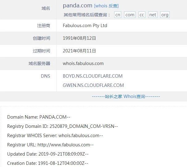 查询whois发现,域名panda.com注册于1991年8月,距今有28年时间,是一枚英文动物域名,含有“熊猫”含义,简洁好记,便于传播且容易记忆,输入也不容易出错,据卖家介绍域名每月搜索量550000+、对应所有手机上的表情符号、提供即时的品牌知名度、超稀有的单词动物域名。对应的终端也是实力不菲,例如PandaDoc(pandadoc.com)、熊猫直播(panda.tv)、熊猫频道(ipanda.com)等等。根据whois历史记录可知,本周panda.com从Network Solutions转到了受隐私保护的Fabulous.com帐户。