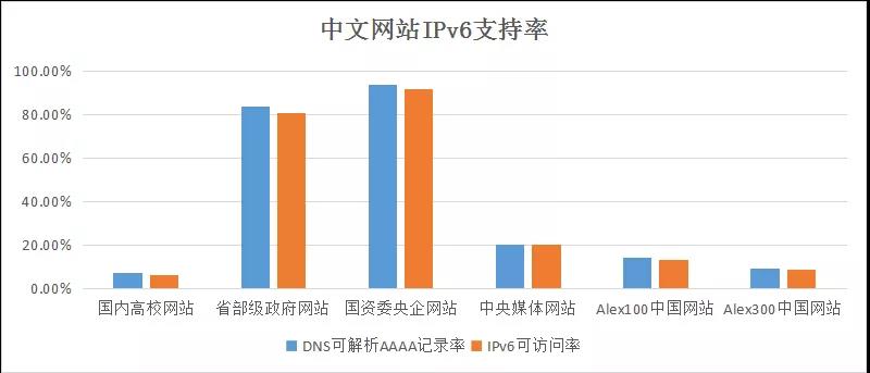 中国教育网提供的测试结果数据从另一个层面印证了有关工作进展,截止到2018年12月31日,中文网站对IPv6的支持率统计如下: